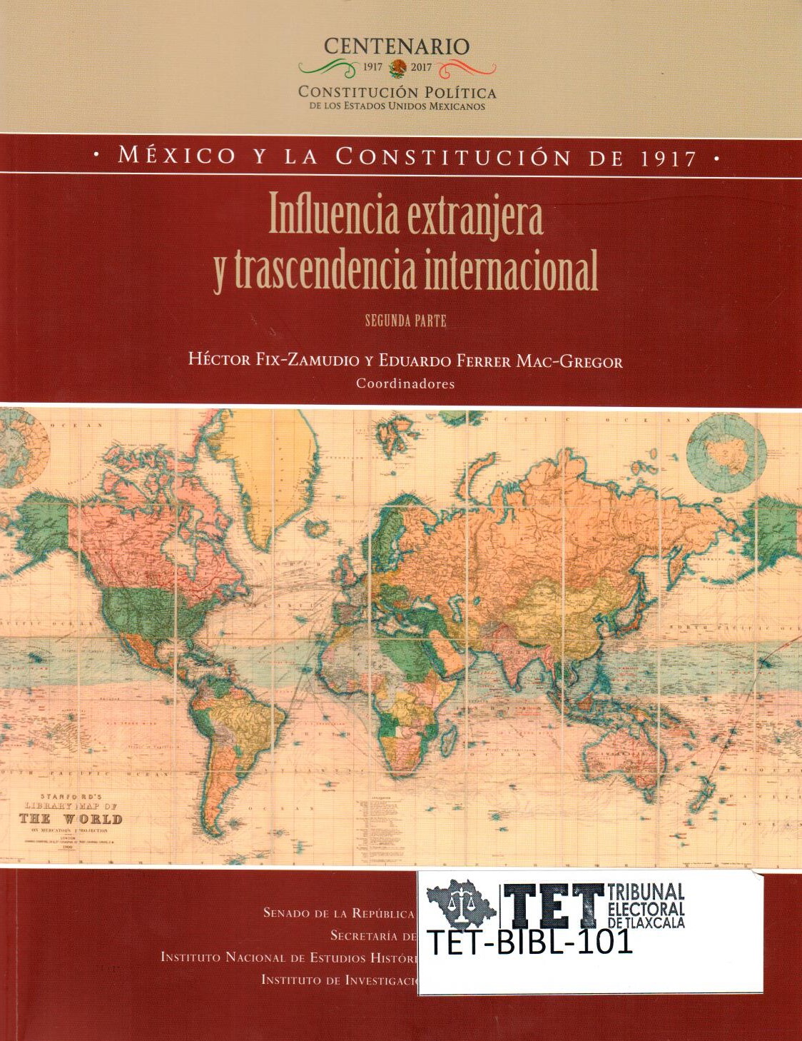 Centenario de la constitución de 1917- México y la constitución de 1917; Influencia extranjera y trascendencia internacional Autor: Fix Zamudio, Héctor; Ferrer Mac-Gregor, Eduardo Editorial:  Secretaría de Cultura Año de edición: 2017 Páginas: 465